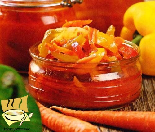 Ингредиенты: сладкий перец - 2 кг, помидоры - 3 кг, морковь - 1 кг, растительное масло - 200 мл, сахар - 150 г, красный винный уксус - 1/4 стакана, соль - 2 ст. л.