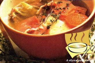 Как приготовить австрийский суп: Свиную рульку вымыть, положить в воду и варить 40 мин. Корень сельдерея вымыть, очистить, крупно нарезать. Лук и фенхель очистить, нарезать полукольцами. Морковь очистить, нарезать крупной соломкой. Зубчик чеснока мелко нарубить.