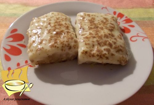 Эту смесь доведите до кипения, а через пять минут снимите с плиты. Пакетик ванильного пудинга разведите в оставшемся яблочном соке, вылейте в кастрюлю и еще проварите около минуты. Выложите получившуюся яблочную массу на остывший бисквит.