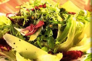 Ингредиенты: сыр пармезан (или любой твердый сыр) - 20 г, салат лолло-россо - 2 листа, салат оклиф - 2 листа, салат фриссе - 1 пучек, руккола - 1 пучек, салат радиччио - 5 листов, кочанный салат айсберг - 1 лист, листья цикория - 5 шт, кедровые орешки - 3 ст. л, приправа "5 перцев" - по вкусу, растительное масло.