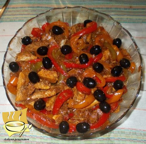 Перец с луком выложите на тарелки, а сверху разместите куриное филе.