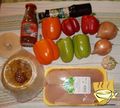 Ингредиенты: болгарский перец - 6 шт, по два красных, зеленых и желтых, мед - 40 г, филе курицы - 600 г, соль, масло растительное для жарки, кетчуп или томатный соус - 40 мл, перец черный, лук - 2 шт, чеснок - 2 зубчика, соус соевый - 40 мл.