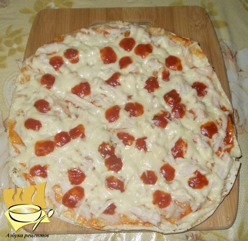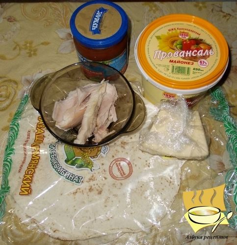 Ингредиенты: лаваши армянские - 3-5 шт, курица копченая - 200 г, сыр - 200 г, соус томатный - 100 г, специи по вкусу.
