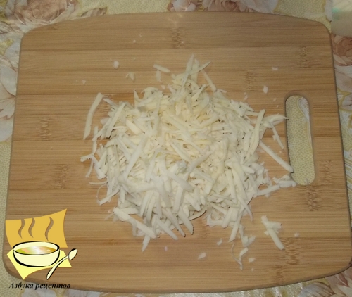 Слегка посыпаем основу тертым сыром и выкладываем начинку.