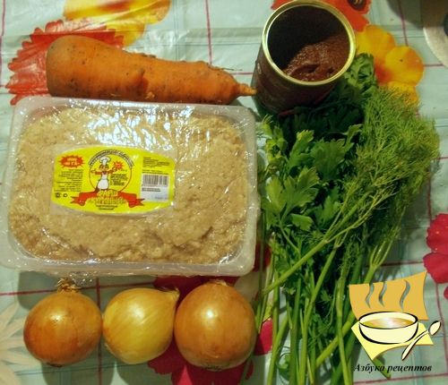 Ингредиенты: фарш куриный - 700-800 г, лук - 2-3 шт, морковь - 1 шт, зелень на ваш выбор, томатная паста или томатный сок.