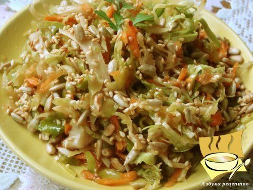 Перед подачей на стол посыпаем готовый салат обжаренными на оливковом масле кедровыми орешками и кунжутными семечками.