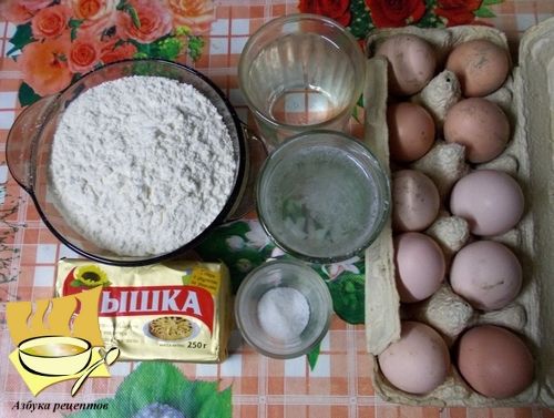 Ингредиенты: маргарин - 250 г, вода - 2 стакана, мука - 2 стакана, яйца - 6-8 шт, соль - 1/2 ч. ложки.