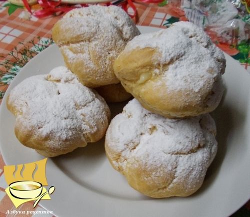Ингредиенты: заварное тесто около 1,5 кг, заварной крем на 1 литре молока, сахарная пудра для посыпки.
