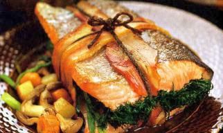 Ингредиенты: форель - 500 г (целым куском), бекон - 4 полоски, картофель - 4 шт, морковь - 2 шт, грибы - 250 г, чеснок - 1 зубчик, зеленый лук - 1 пучек, укроп - 1 пучек, растительное масло для жарки, перец черный молотый, соль - по вкусу.