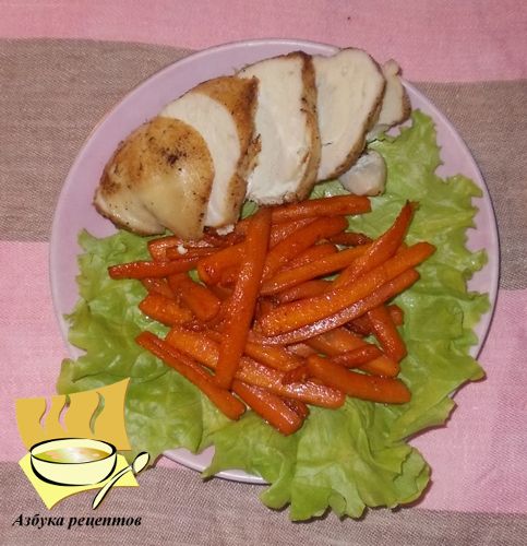 Добавьте к овощу чеснок и посыпьте морковь сахаром, продолжайте обжаривать до тех пор, пока сахар не начнет карамелизироваться. Запеченное филе нарежьте небольшими ломтиками, разложите по тарелкам, а рядом с курицей выложите водяной кресс и карамелизированную морковь.