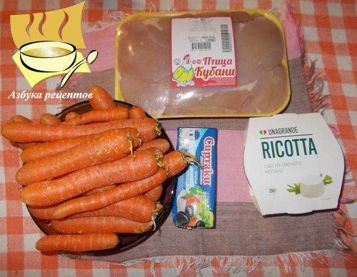 Ингредиенты: рикотта - 100 г, филе грудки куриной - 4 шт, водяной кресс - 100 г, сахар - 15 г, морковь - 500 г, фета - 100 г, сливочное масло - 50 г, чеснок - два зубчика, растительное масло для жарки, черный перец, зелень петрушки рубленная - 3 ст. ложки, соль, сок и цедрау половинки лимона.