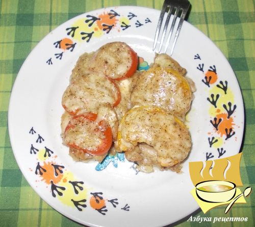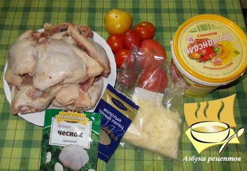 Ингредиенты: окорочок куриный - 10 шт или филе курицы - 5 шт, помидоры большие - 5 шт, сыр - 100 г, майонез, соль и черный перец по вкусу.