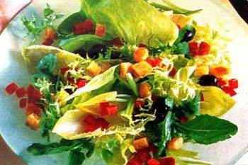 Выложить салат на тарелки и посыпать хлебными кубиками (непосредственно перед подачей к столу).