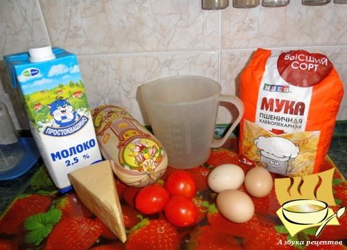 Ингредиенты: куриные яйца - 3 шт, молоко - 150 г, мука - 1 ст. л, помидоры средние - 3 шт, вареная колбаса - 50 г, сыр - 30 г, соль по вкусу.