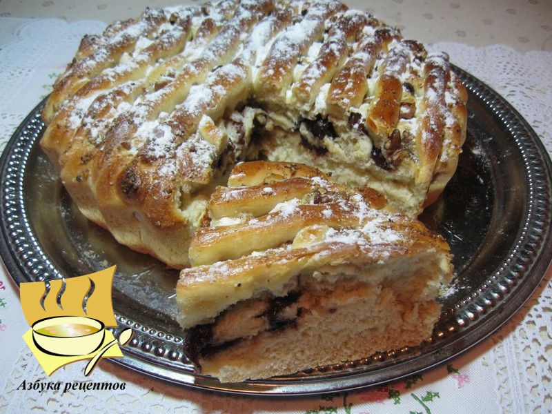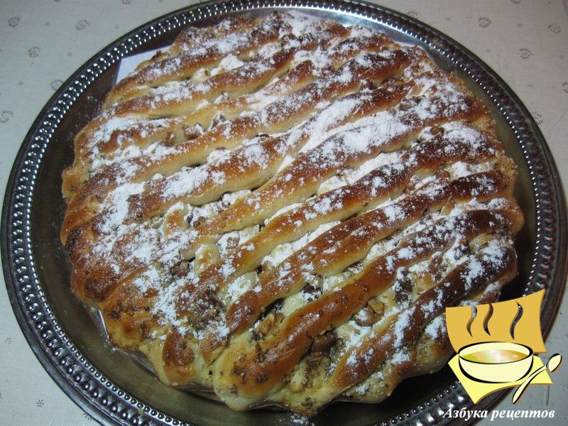В каждую ячейку решетки положите кусочек ореха, по краю пирога насыпьте ореховой крошки. Оставьте пирог для на 40 минут.