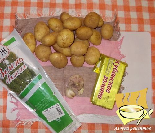 Ингредиенты: картофель молодой - 2 кг, масло сливочное - 150 г, чеснок - 1 головка, укроп - 1 пучок (50 г), соль по вкусу.