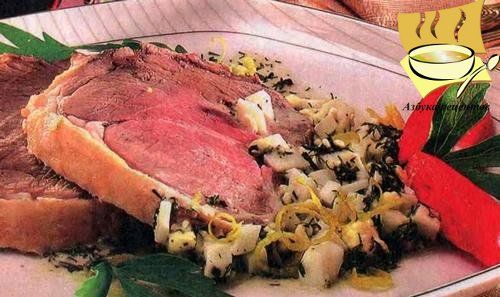 Для соуса: 1 зубчик чеснока нарубите, разотрите с зеленью, добавьте масло, 3 ст. л. бульона, мелкорубленые яйца, приправьте солью, перцем и перемешайте. Нарежьте мясо поперек волокон на куски. Подавайте с соусом.