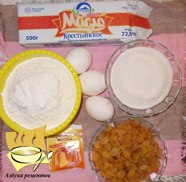 Ингредиенты: масло сливочное - 175 г, сахар - 175 г, яйца - 3 шт, изюм без косточки - 175 г, мука - 250 г, разрыхлитель - 1 ч л, ванилин или ванильный сахар - 1 пакетик, коньяк - 2 ст. ложки, щепотка соли.