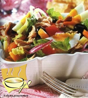 Ингредиенты: яйца - 4 шт, 1 ст. длиннозерный рис - 1 стакан, помидоры большие - 2 шт, большая луковица, черные маслины без косточки - 50 г; оранжевый сладкий перец оранжевый - 1 шт, пучок рукколы, консервированный тунец в масле или в собственном соку - 400 г. Для заправки: белый винный уксус - 2 ст. л, оливковое масло - 3 ст. л, соль, молотый черный перец.