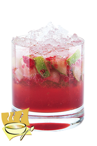 Ингредиенты: водка - 35 мл, малиновый сироп - 25 мл, содовая - 150 мл, яблоко зеленое - 100 г, лимон - 40 г, малина - 15 г, лед дробленый - 200 г.