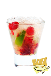 Ингредиенты: водка - 50 мл, ванильный сироп - 5 г, сахарный сироп - 5 г, сок лайма - 25 г, сок винограда - 70 г, лед кубиками - 100 г, лед дробленный - 75 г. Для украшения: красный виноград, долька лайма.