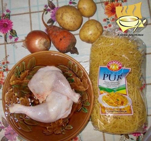 Ингредиенты: курятина - 300-400 г, картофель - 3 шт, морковь - 1 шт, лук - 1 шт, лапша - 50 г, соль перец по вкусу, зелень для заправки.