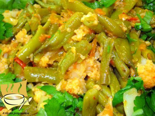 Ингредиенты: стручковая фасоль - 300 г, цветная капуста - 300 г, луковица, морковь, помидорки - 1-2 шт, специи.