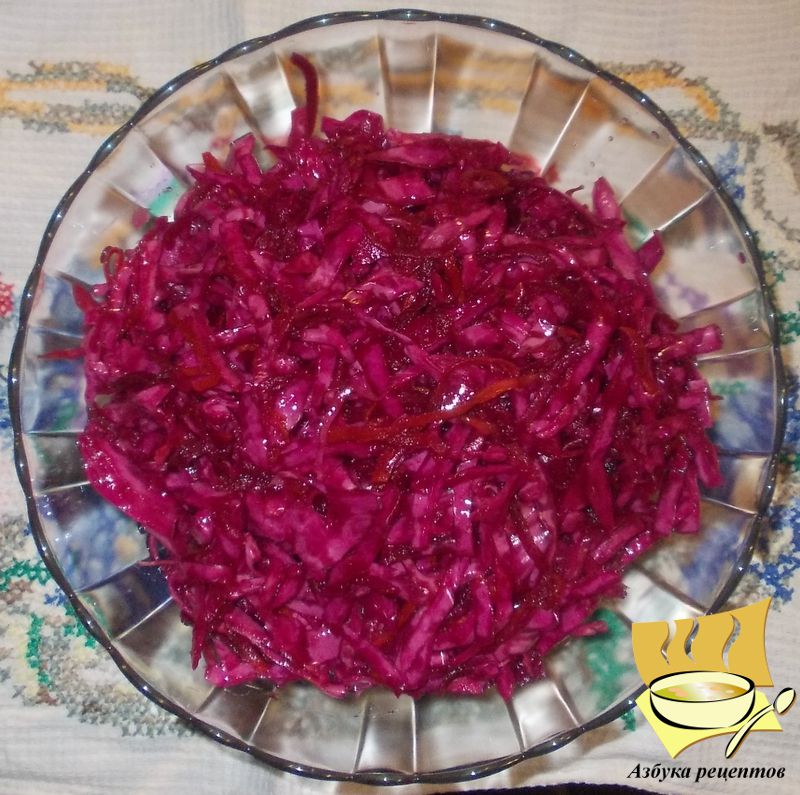 В отдельной емкости перетираем морковно-свекольную смесь с шинкованной капустой.