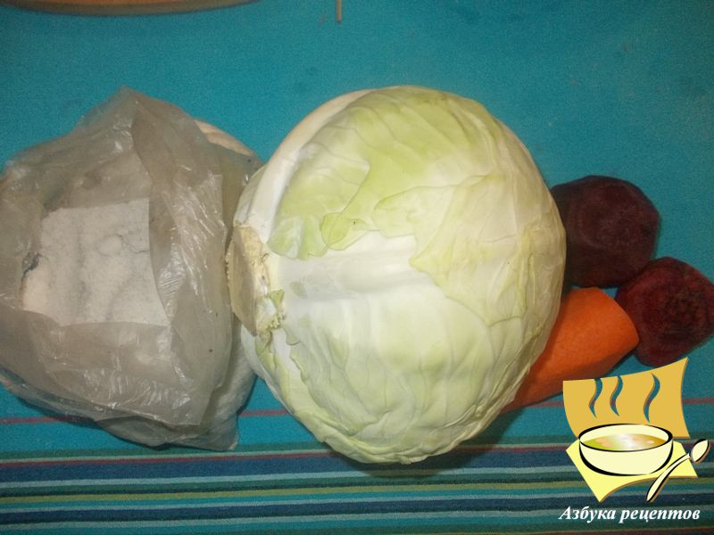 Ингредиенты: кочан капусты - 2-3 кг, свекла средних размеров - 2 шт, морковь большая - 1 шт, соль крупная.