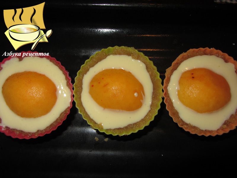 Наливаем сметанную начинку с таким расчетом, в нее должен погрузиться абрикос и при этом масса не должна выползти за края корзиночки.