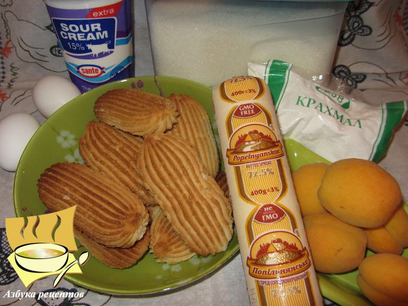 Ингредиенты: печенье – 350 г, масло сливочное – 200 г, яйца – 2 шт, крахмал – 2 столовые ложки, сметана – 400 г, сахар – 100 г, абрикосы 500-750 г.