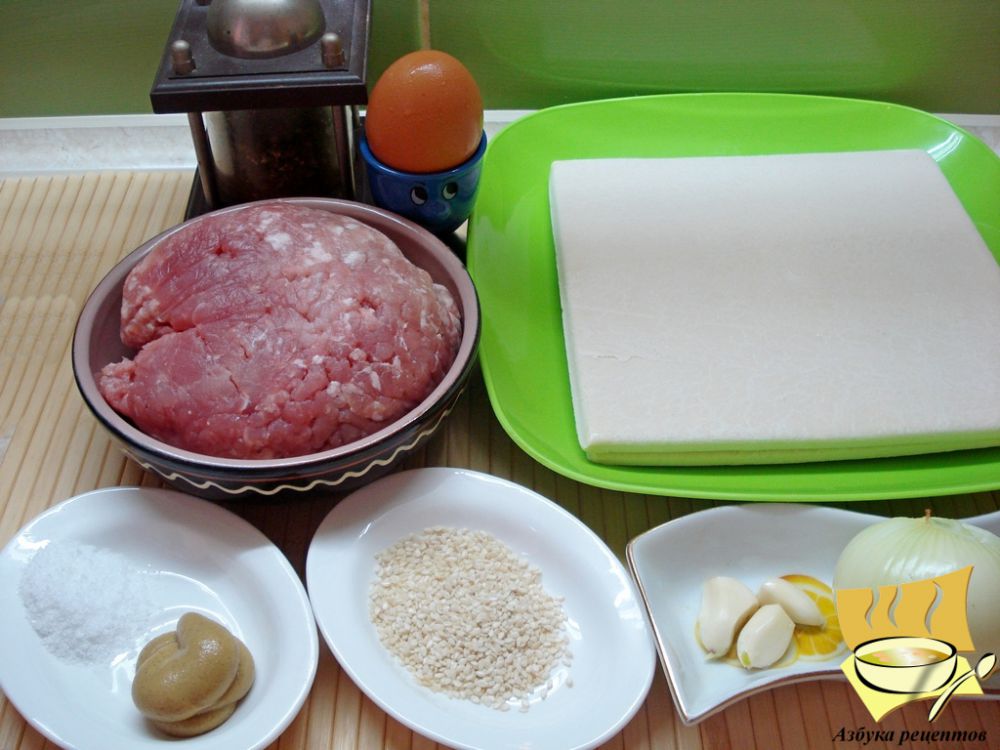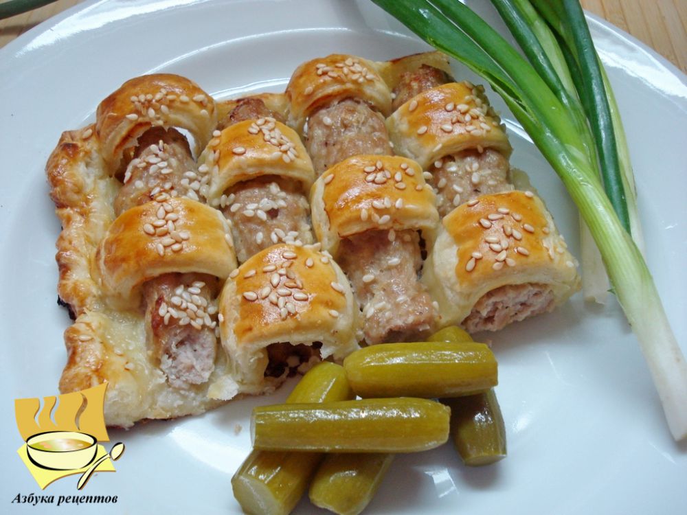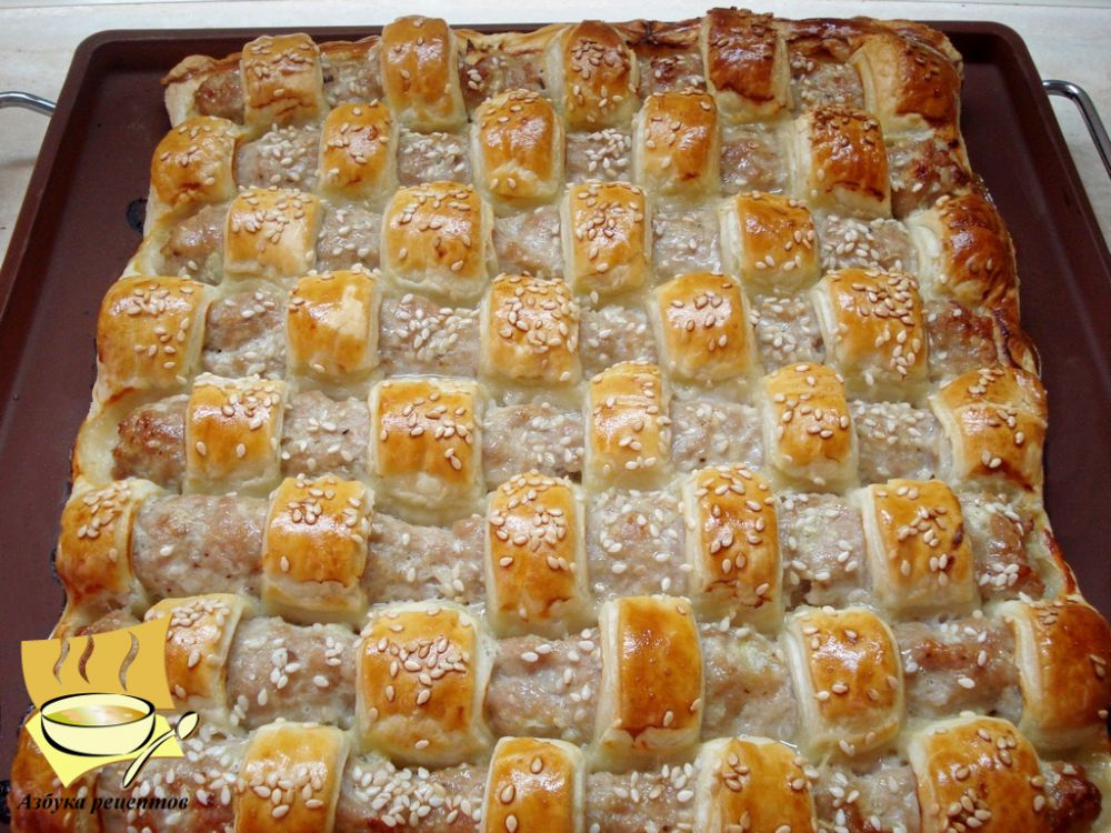 Ингредиенты: мясной фарш - 800 г, слоеное тесто - 500 г, соль - 1,5 ч. ложки, яйцо - 1 шт., черный перец - 0,5 ч. ложки, чеснок - 3 зубка, кунжут - 2 ч. ложки, лук - 1 шт., горчица - 1,5 ч. ложки.