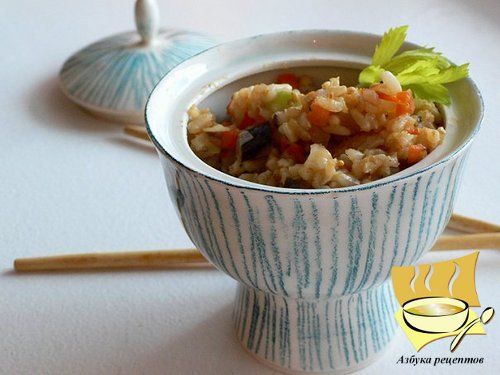 Баклажан режем кольцами, чуть присаливаем и оставляем на 15 минут, чтобы «убрать» горечь. Лук, кабачок и морковь мелко режем, помидоры очищаем от кожицы и измельчаем в пюре. Баклажан промываем от излишков соли и режем мелкими кубиками. Овощи тушим в небольшом количестве оливкового масла с добавлением кунжута, семян горчицы и кумина – это займет не более четверти часа. Выкладываем в овощи рис, сбрызгиваем массу каплей соевого соуса, перемешиваем и украшаем зеленью (отлично подойдет кинза или петрушка).
