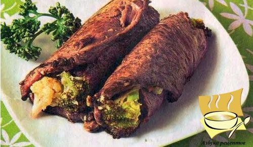 На куски мяса уложить овощной фарш, посыпать тертым сыром, свернуть в рулетики и скрепить шпажками. Рулетики выложить в овальную сковороду с антипригарным покрытием, полить оставшимся маслом и запекать при 220 С около 20 мин. При подаче можно оформить зеленью укропа или петрушки.