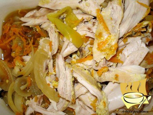 Ингредиенты: отварное куриное филе - 400 г, лук - 1 шт, пару небольших морковок, два болгарских перца, 2-3 небольших помидорки.