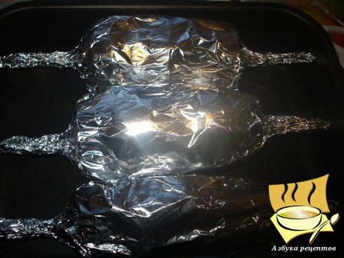Потом необходимо завернуть в фольгу в виде большой конфетки. Печь при 225 градусах 10 минут.