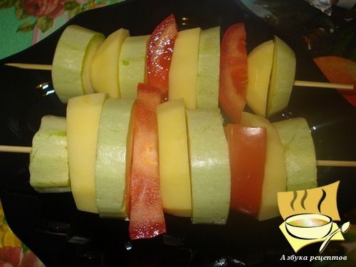 Как приготовить шашлык "Аппетитный": Для начала следует аккуратно порезать все ингредиенты как можно тоньше. Далее ломтики кабачков, помидоров и картошки одеть на шпажки, совсем немного добавить майонеза.