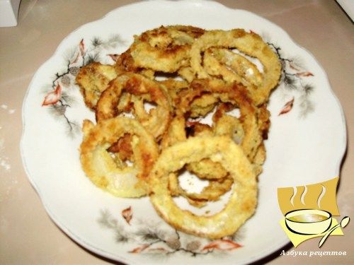 Колечка лука, отцеживаем на сите, обваливаем в муке (50 г).