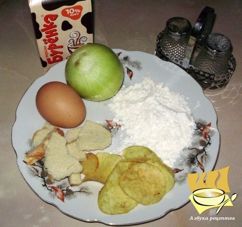Ингредиенты: лук - 2 шт большие, хлеб - 2 ломтика, маленькая упаковка чипсов - 20-30 г, мука - 130+50 г, яйца - 1 шт, сметана или йогурт - 200 мл.