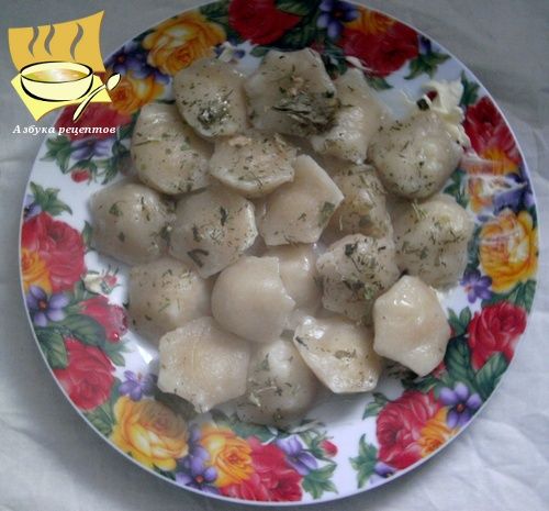 Готовое изделие закидываем в кипящую воду и варим до готовности. Подаем на стол с маслом, сметаной, уксусом, зеленью.