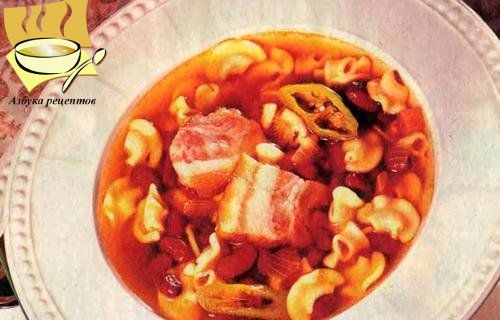Ингредиенты: мясной бульон - 2 л, сырокопченая грудинка - 400 г, макароны - 100 г, красная фасоль - 100 г, помидоры - 2 шт, морковь - 1 шт, лук репчатый - 1 шт, чеснок - 1 зубчик, перчик чили - 1 шт, тимьян - 2-3 веточки, соль по вкусу.