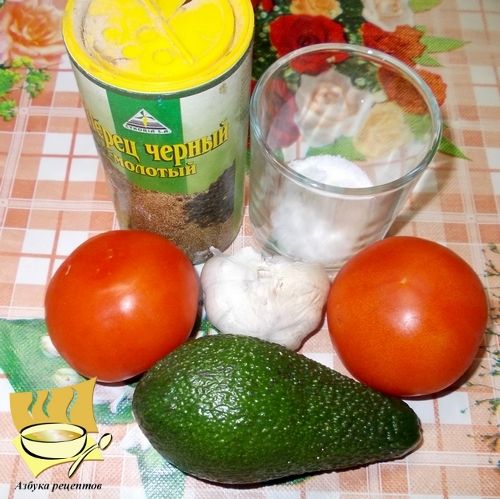 Ингредиенты: помидоры - 2 шт, авокадо - 1 шт, чеснок - 2 зубчика, соль, перец по вкусу.