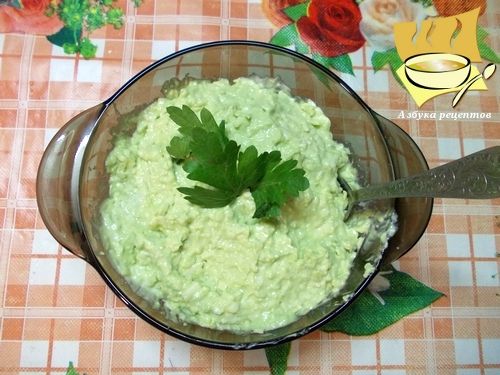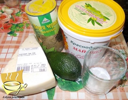 Ингредиенты: авокадо - 1 шт, сыр - 100 г, чеснок - 3 зубчика, майонез - 2 ст. ложки, соль и черный перец по вкусу.