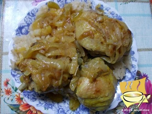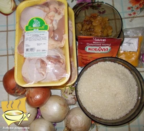 Ингредиенты: курятина, бедрышки или голени, или мелкие окорочка - 2 кг, 700-1000 г лука (лука должно быть много, но можно по вкусу), изюм без косточки - 100 г, головка чеснока, вино белое - 200-300 мл, шафран, кайенский перец, соль, лавровый лист по два листочка на каждый слой мяса, рис - 400-500 г, растительное масло для жарки.