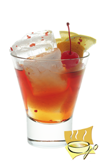 Перелейте получившееся содержимое в стакан, украсьте вишней, апельсином, лимоном и цедрой!