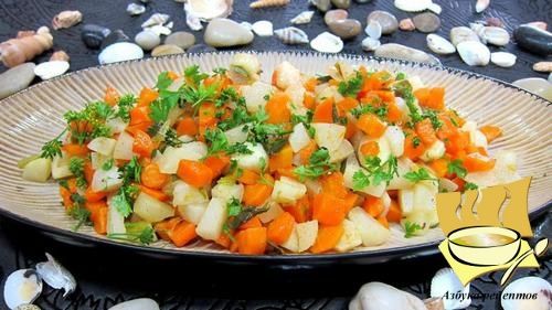 Сковороду снимаем с огня. Овощи перекладываем в большое блюдо, посыпаем мелко измельчённой петрушкой и подаем на стол.