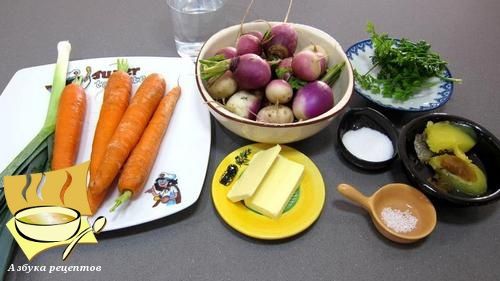 Ингредиенты: репа - 500 г, 25 г меда (можно заменить сахаром), соль крупная - 1/2 чайной ложки, сливочное масло - 40 г, куриный бульон - 40 мл, лук-порей - 40 г, морковь - 450 г, теплая вода - 270 г, мелкая соль - 1/4 ч. ложки, пряности, 5 г свежей петрушки.