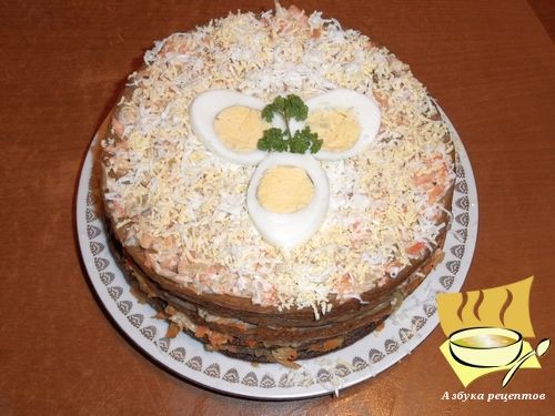 Когда все блинчики будут готовы, начинаем собирать пирог: последовательно чередуем блинчики и овощную начинку.