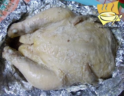 Иногда хочется отдохнуть от специй, но в то же время съесть что-нибудь вкусное. Блюда на пару у нас не пошли, отварную курятину у нас тоже едят по настроению, а вот такая курочка пошла на ура. Готовится очень очень просто. Иногда мы ее готовим только с майонезом. Вкус получается что-то между отварной и запечённой, очень нежный и сочный.
