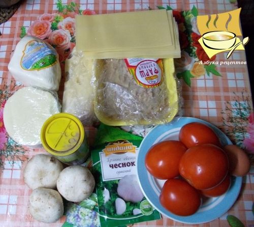 Ингредиенты: пластины для лазаньи - 9 шт, сыр мацарелла - 400 г. Для начинки: сыр маасдам - 100 г, сыр адыгейский творожный - 300 г, яйца - 1 шт, фарш - 300 г. Для соуса: грибы - 3-5 шт, помидоры - 5-7 шт, лук - 1 шт, соль, итальянские травы, черный перец, чеснок (можно положить еще 1 стебель сельдерея), растительное масло - 2 ст. ложки.